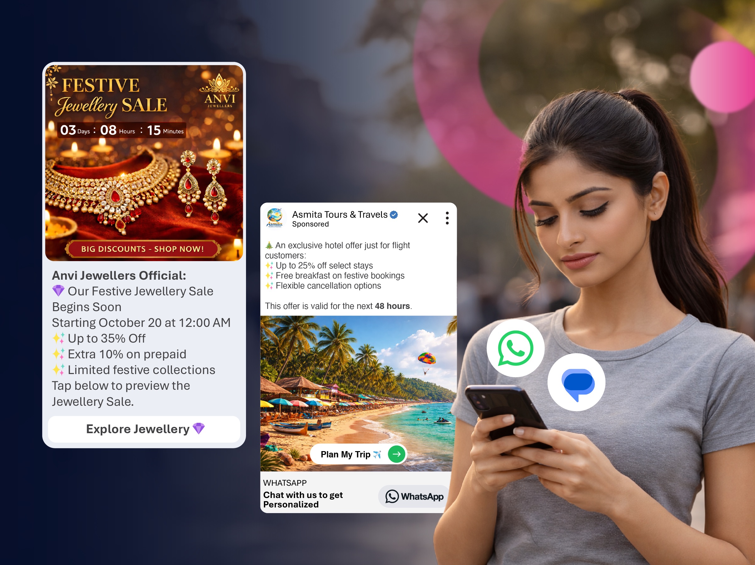- WhatsApp supports buttons, carousels, product cards, images, videos, and even PDFs inside one conversation.