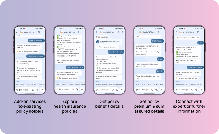 By adopting RCS Business Messaging as both a service and education channel, Apollo 24|7 simplified complex insurance journeys and built greater user trust. This not only improved customer experience but also translated into higher conversions.