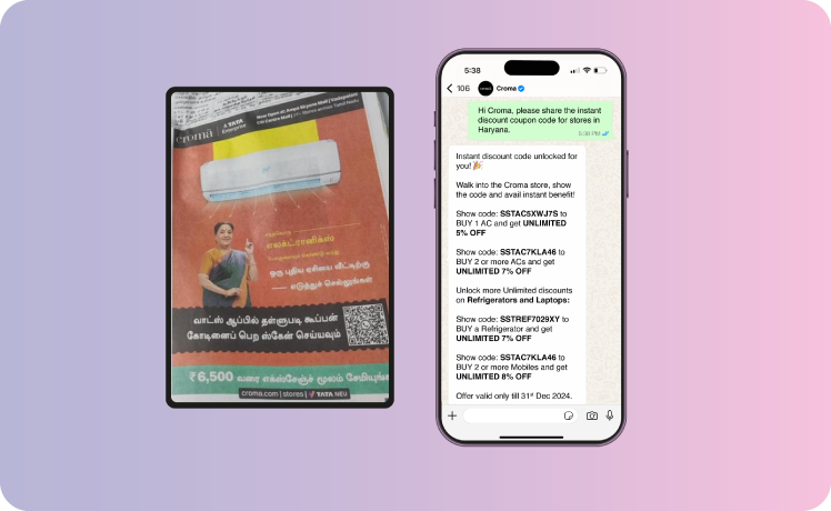 During the summer sale, Croma used QR codes and a WhatsApp bot to offer personalized coupon codes. Users discovered the QR codes on newspaper ads and other channels, which upon scanning opened a WhatsApp chat with Croma’s chatbot.