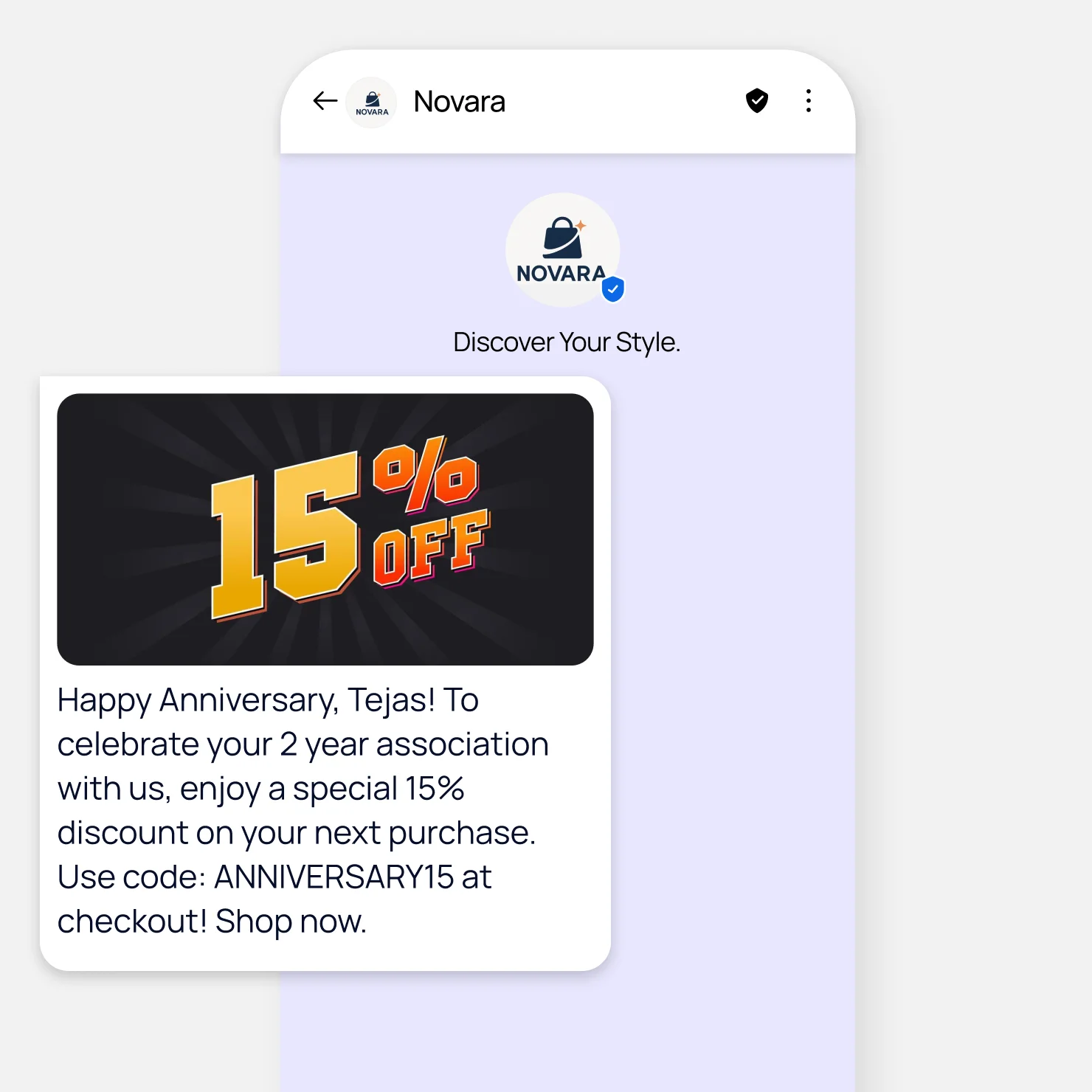 Trigger personalised offers, flash sale reminders, and one-click coupons. Send loyalty point balances and seasonal rewards to drive repeat purchases and higher CLV.