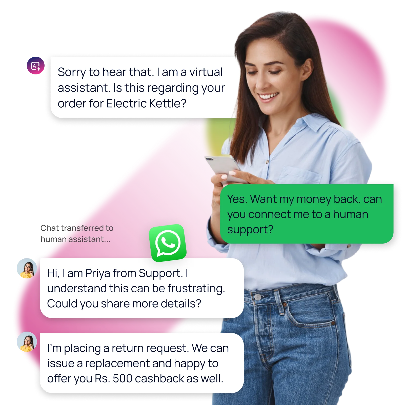 When a bot cannot solve an issue, conversations escalate smoothly to the human agent with full context, so customers never need to repeat themselves.