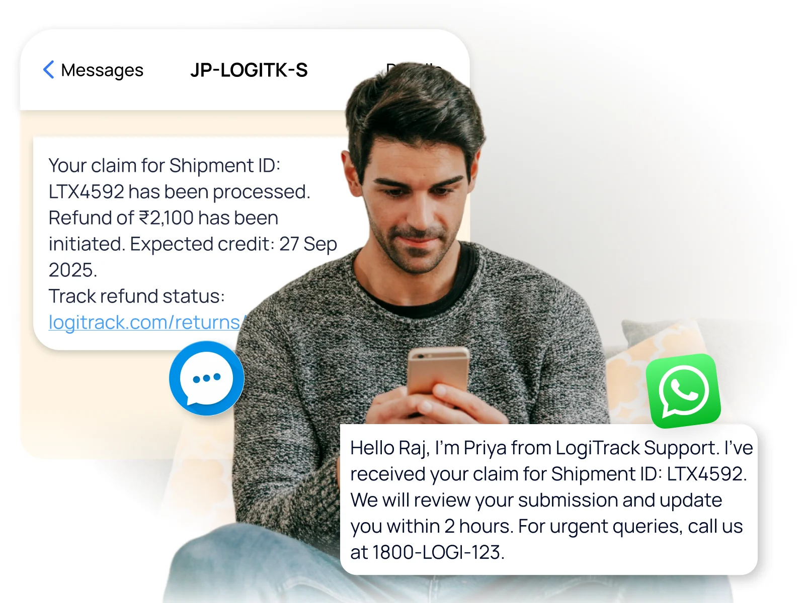 Verified, branded experiences with guided replies and visual options that help customers select support actions with automatic SMS fallback.